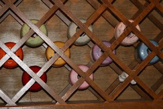 Then I had an idea! I don't drink wine so the bottle rack in bar area of my house has been empty since we moved in. Now it is the designated yarn rack. I just used some kabob sticks to rolls in place since they are not long enough to stay on their own.